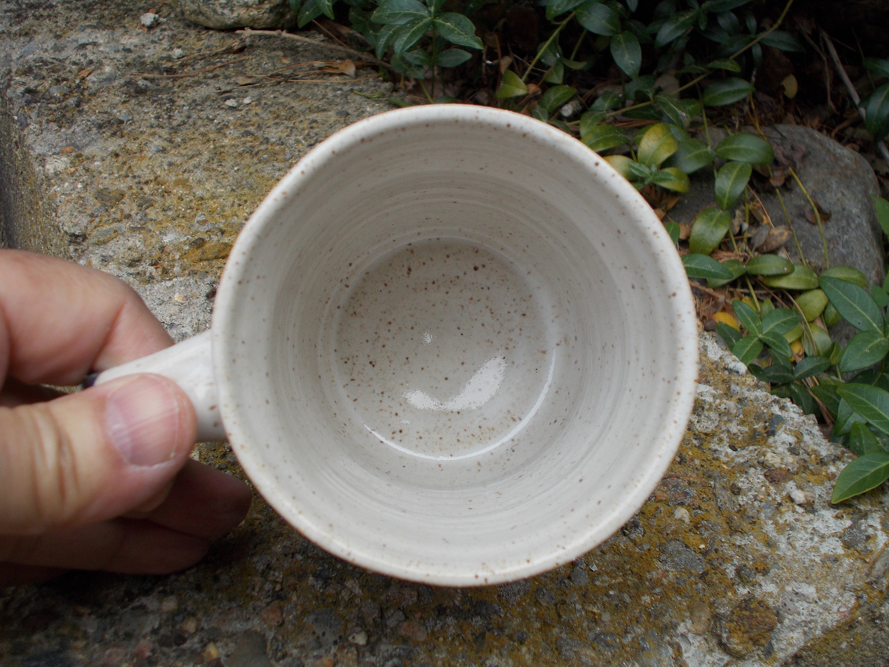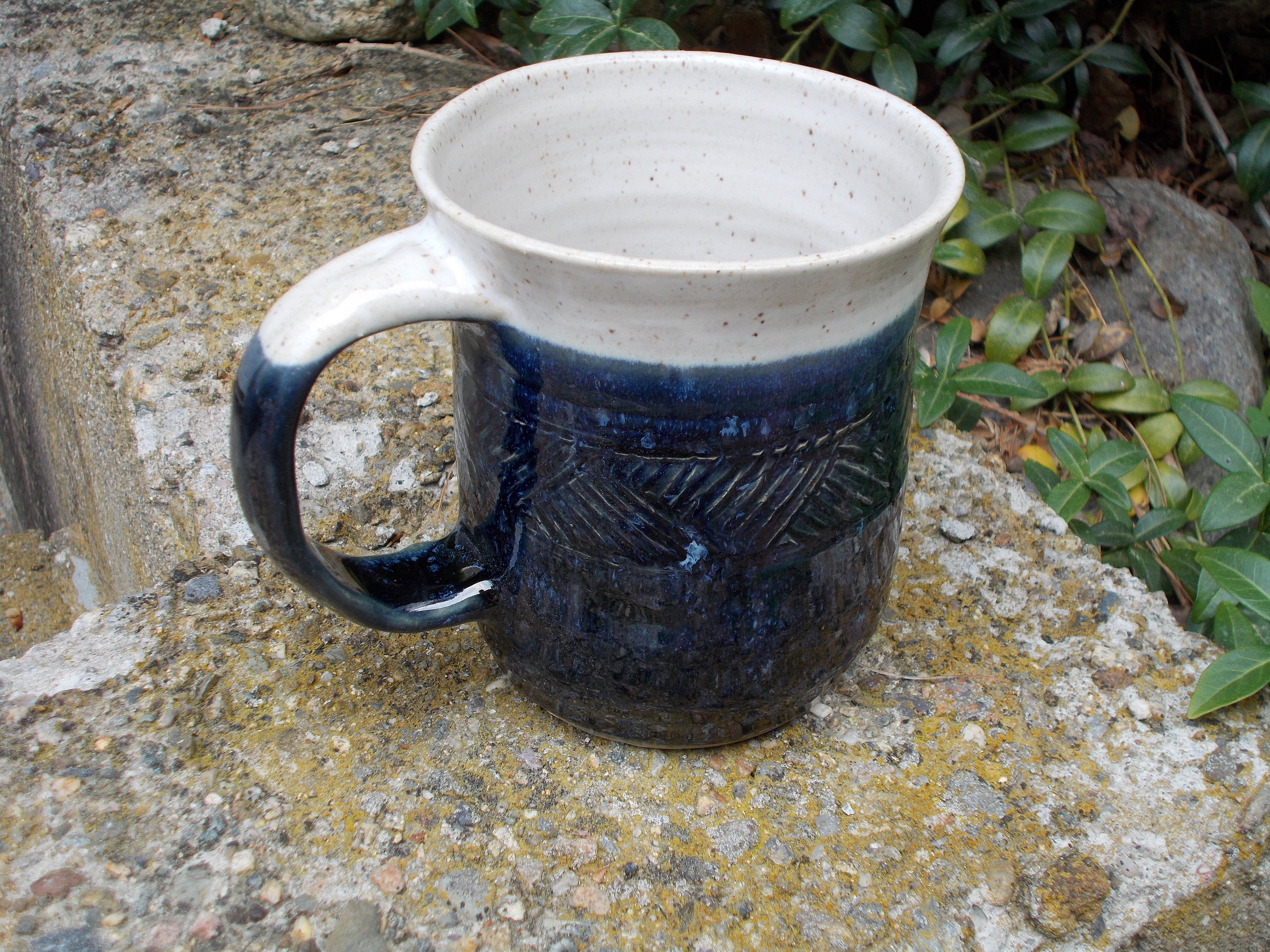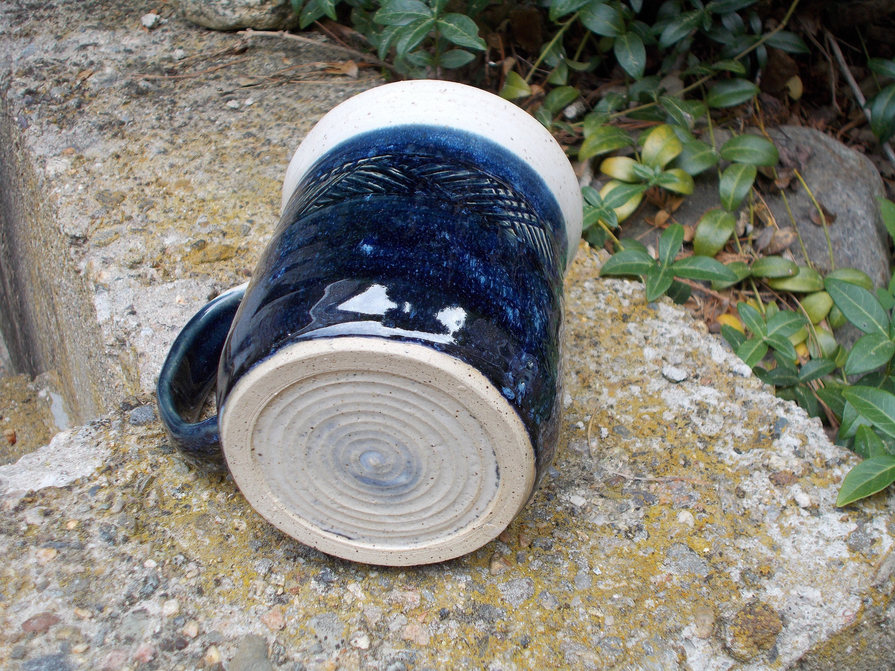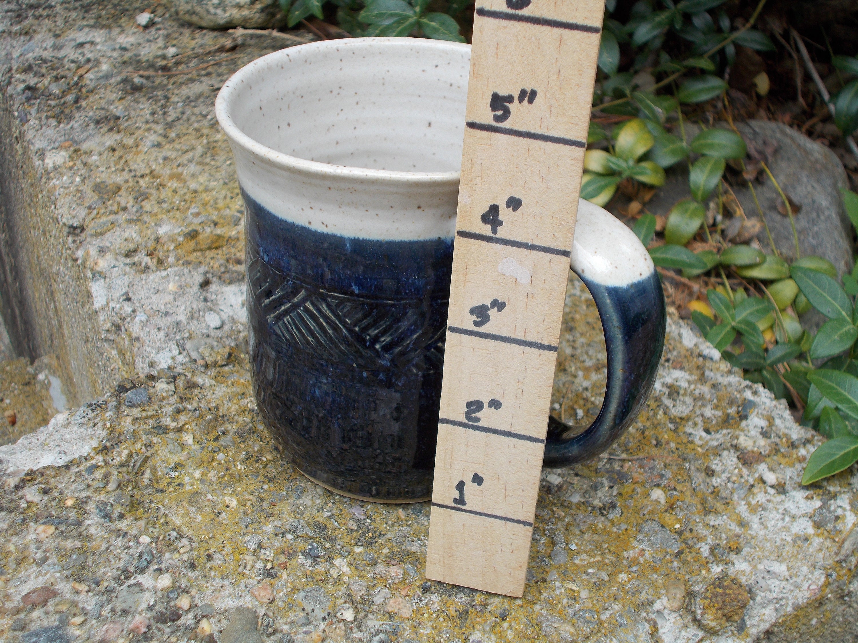 This is a large cup and holds a pint. The cup is made from a buff stoneware clay. The glazes I used were applied at a workshop, so the glazes are not mine. The cup was immersed in a white, opal glaze. Then, the outside was immersed in a black glaze over the carved work on the outside of the cup. Inexplicably, the kiln turned the workshop's black glaze to a dark blue. Kilns play tricks on potters all the time.
