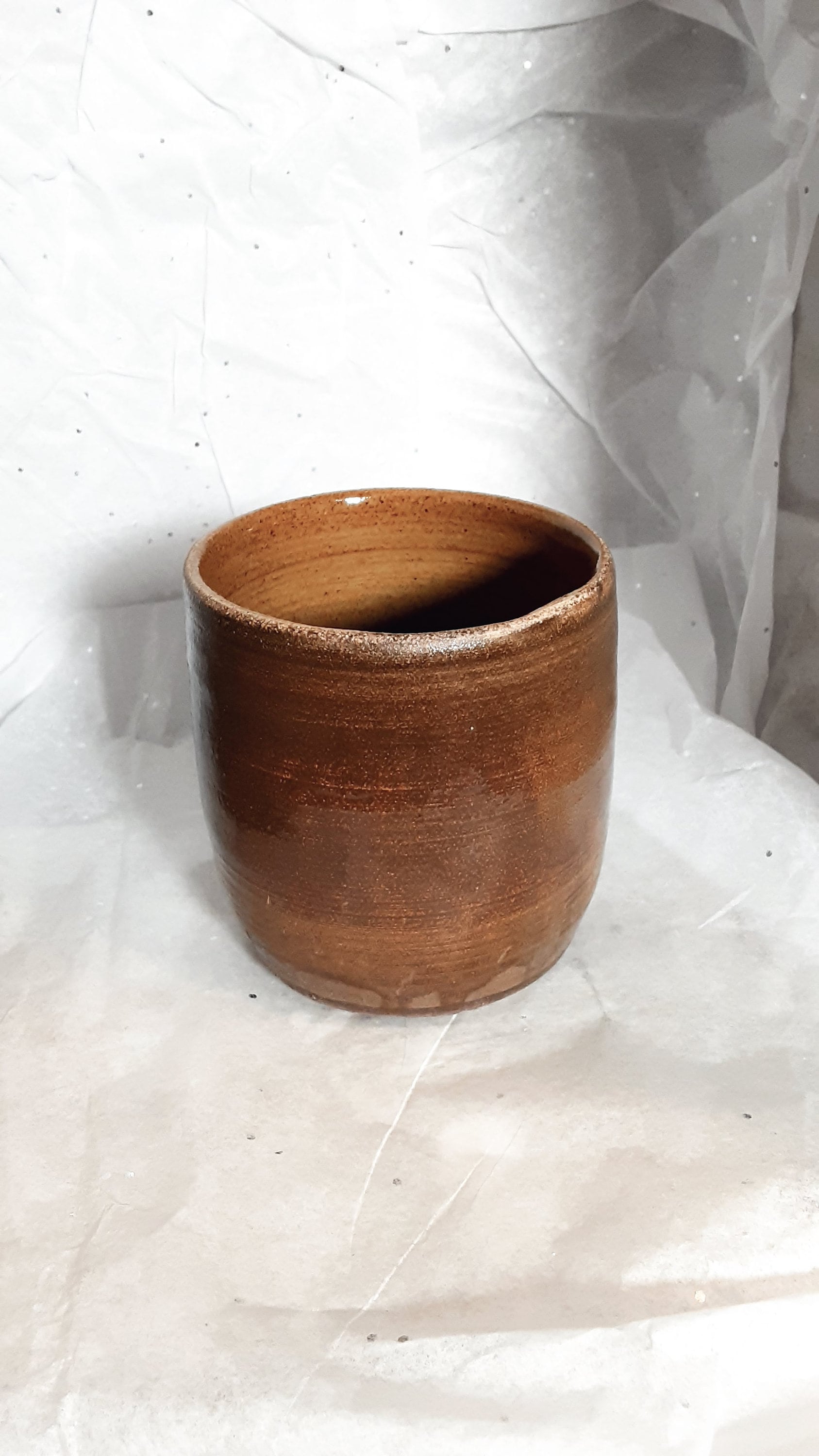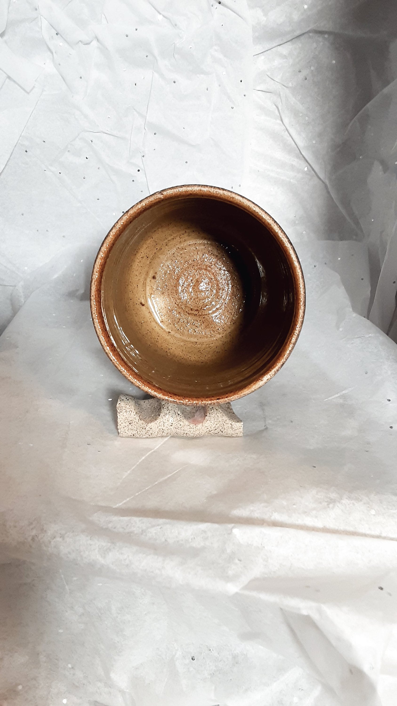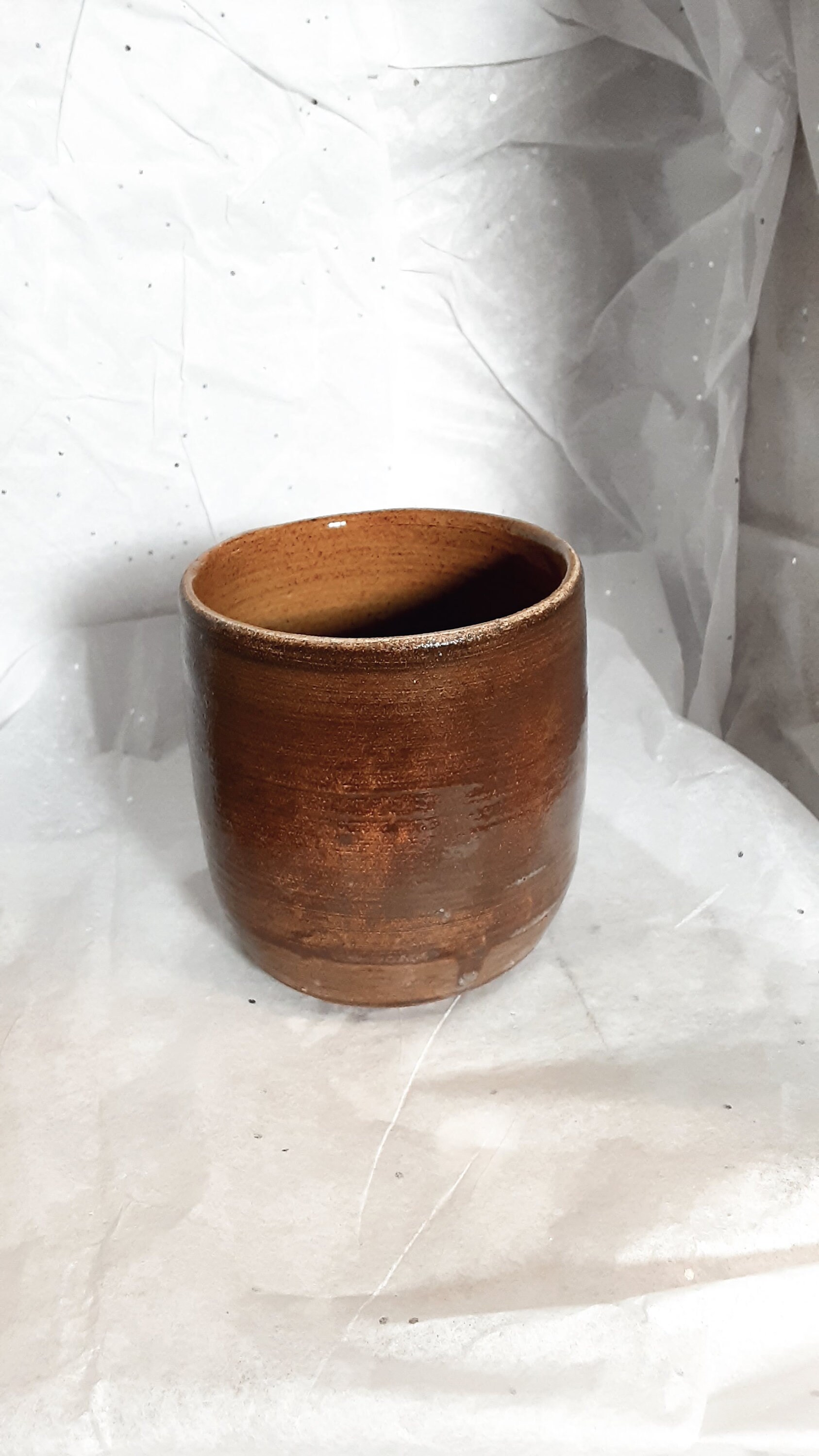The tumbler is made with buff stoneware clay. It's entirely coated in colored glazes which hide the clay color. The exterior was sprayed with a dark tenmoku that fired light. I can't explain that. The kiln fire gods know. The interior was sprayed with a Shino glaze.