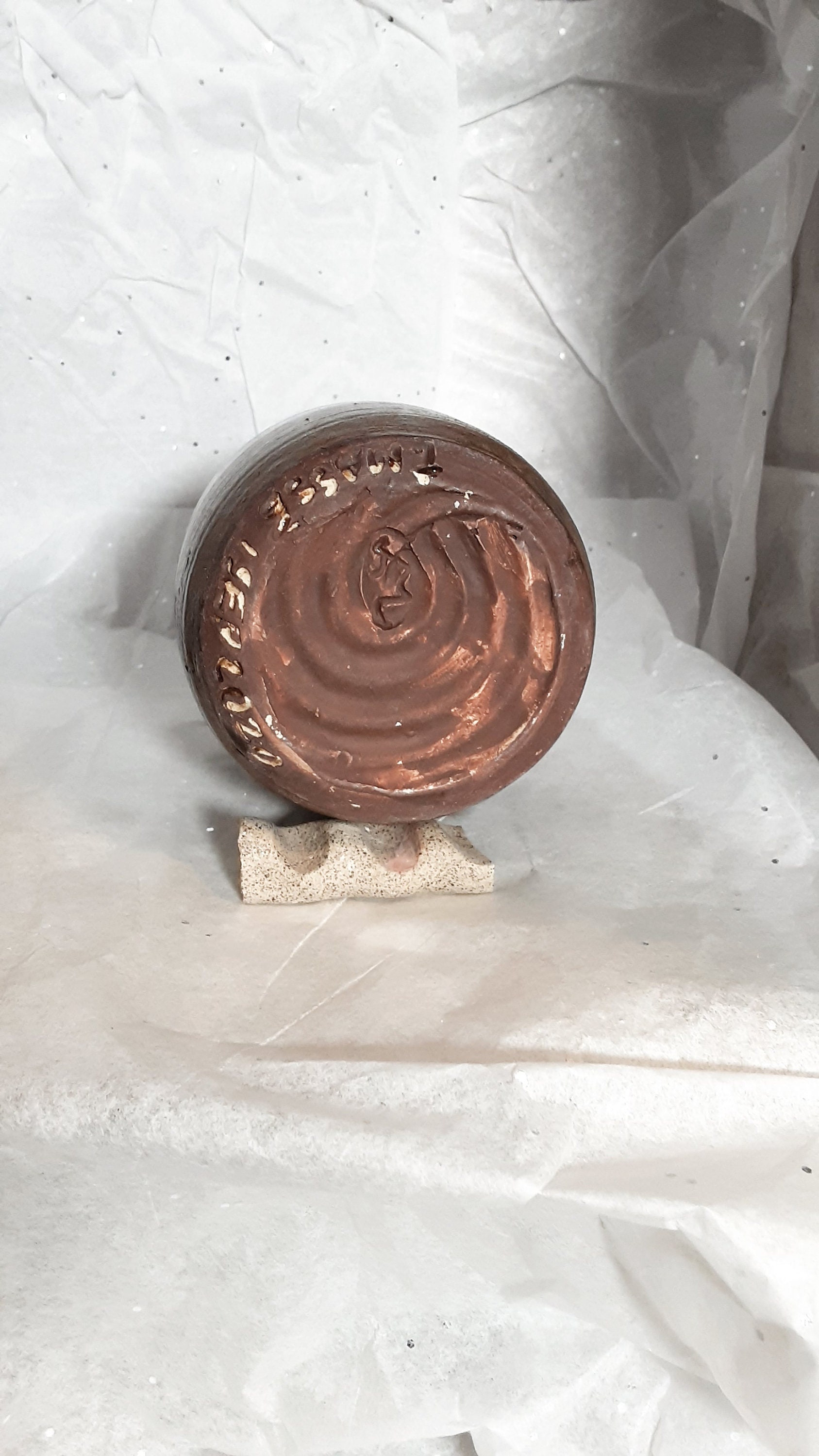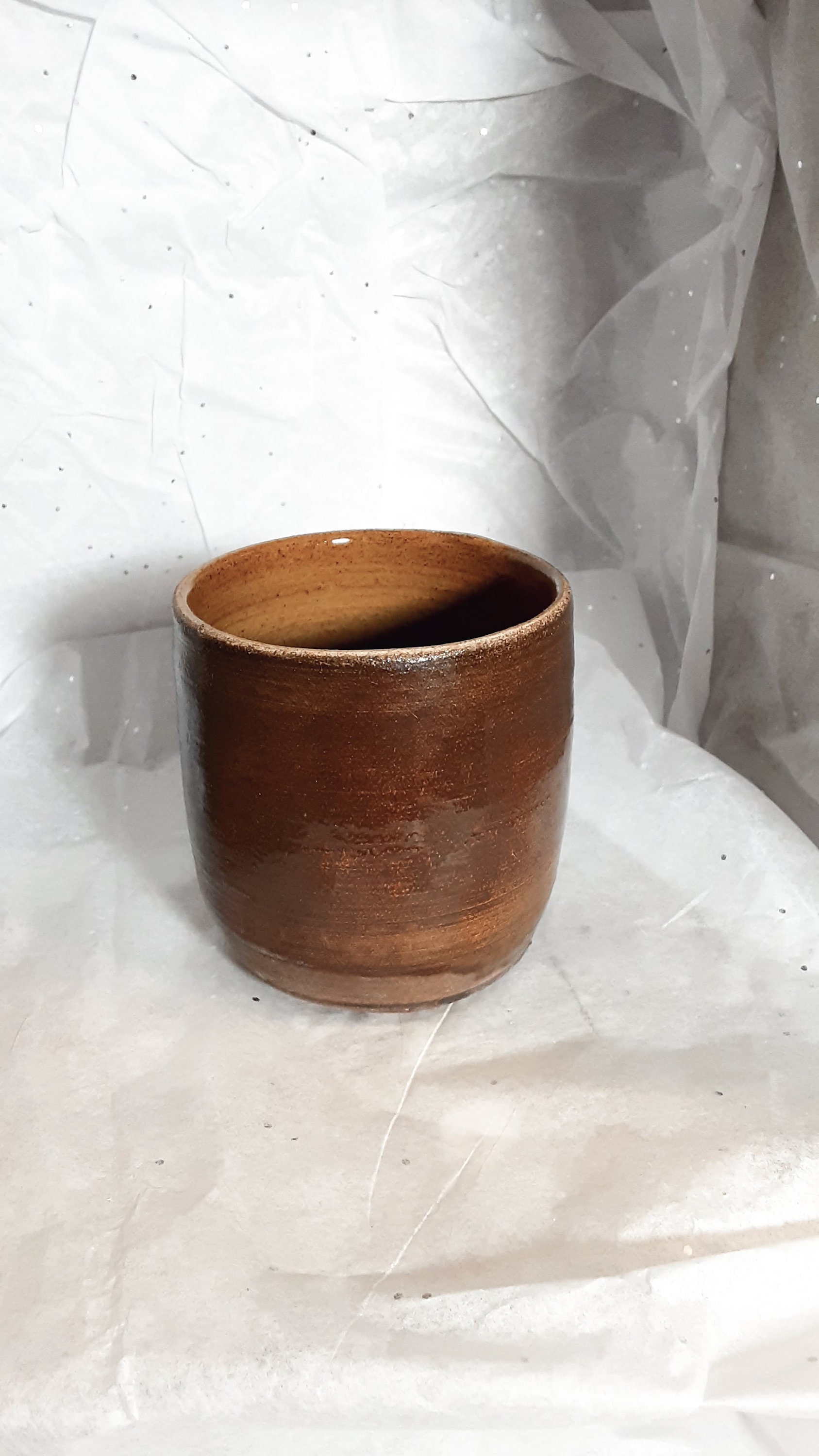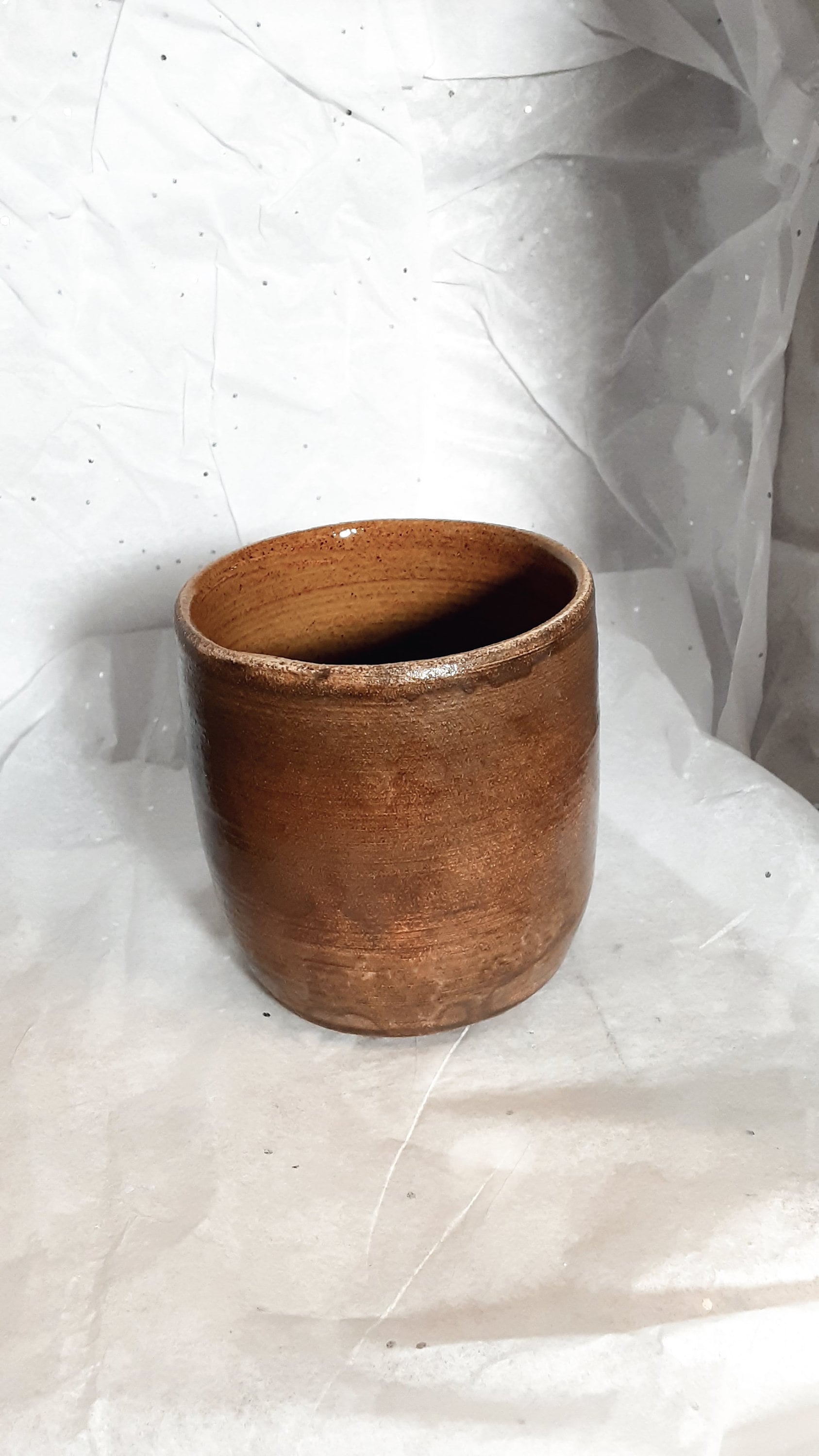 The tumbler is made with buff stoneware clay. It's entirely coated in colored glazes which hide the clay color. The exterior was sprayed with a dark tenmoku that fired light. I can't explain that. The kiln fire gods know. The interior was sprayed with a Shino glaze.