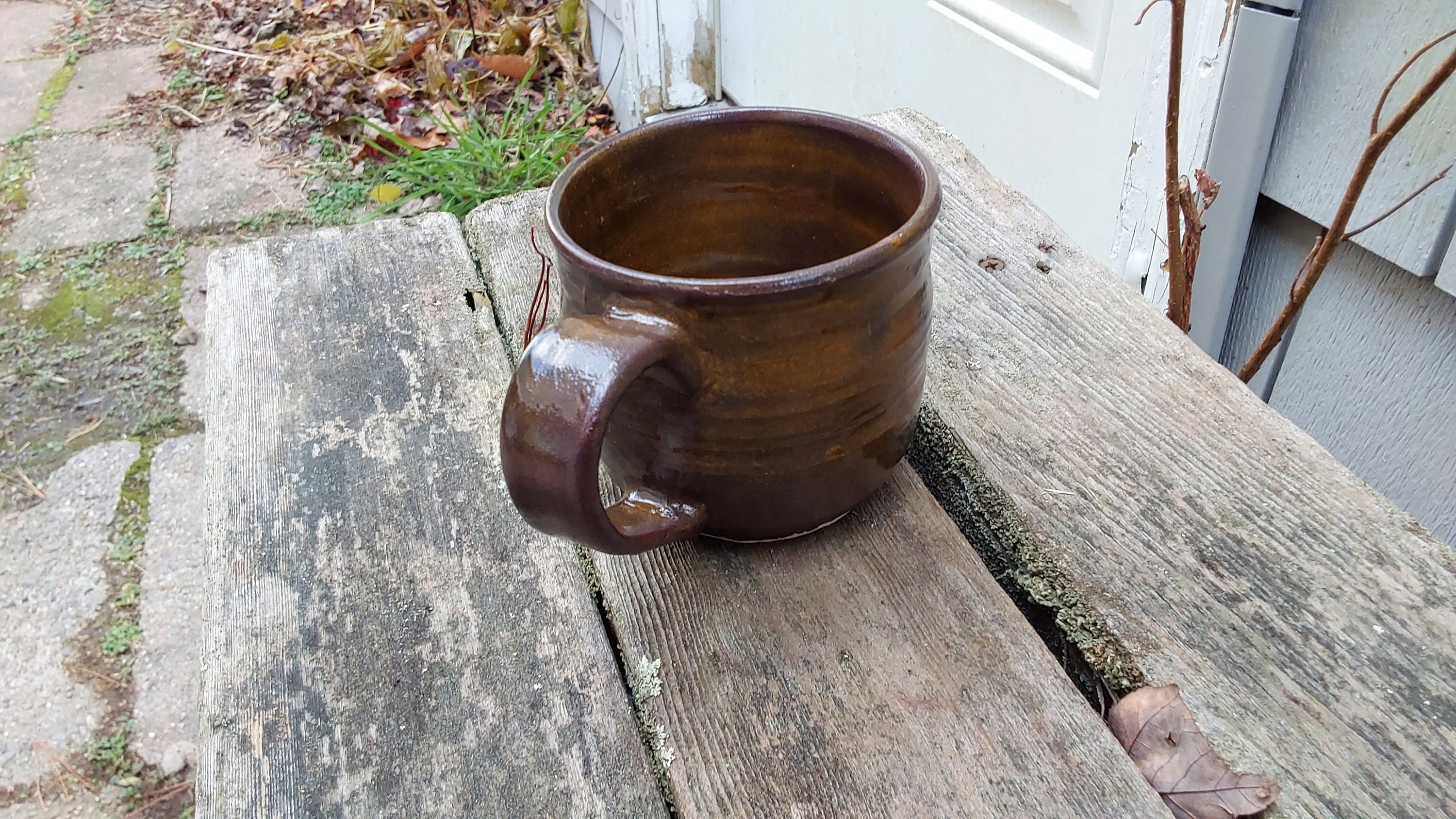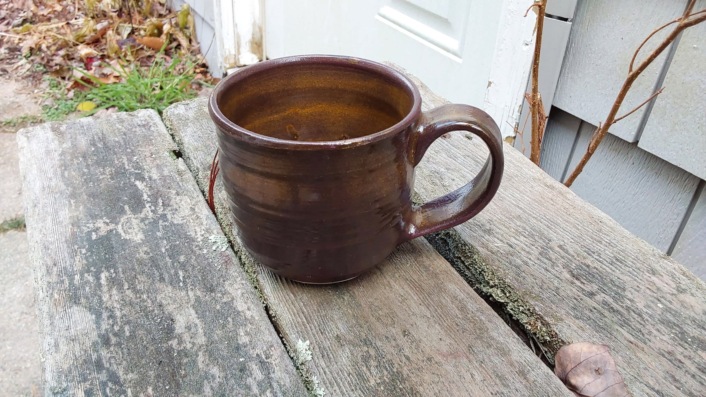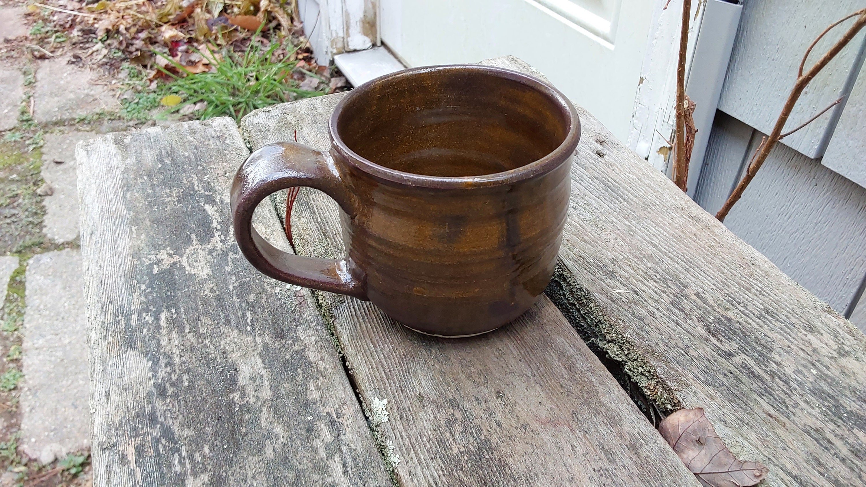 Cup is made from speckled stoneware clay. The cup has 2 coats of the brown tenmoku glaze which covers the clay speckles
