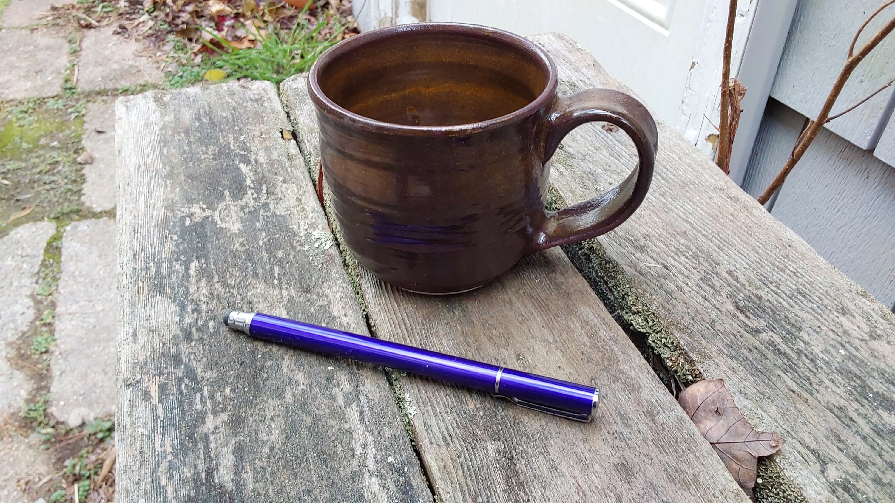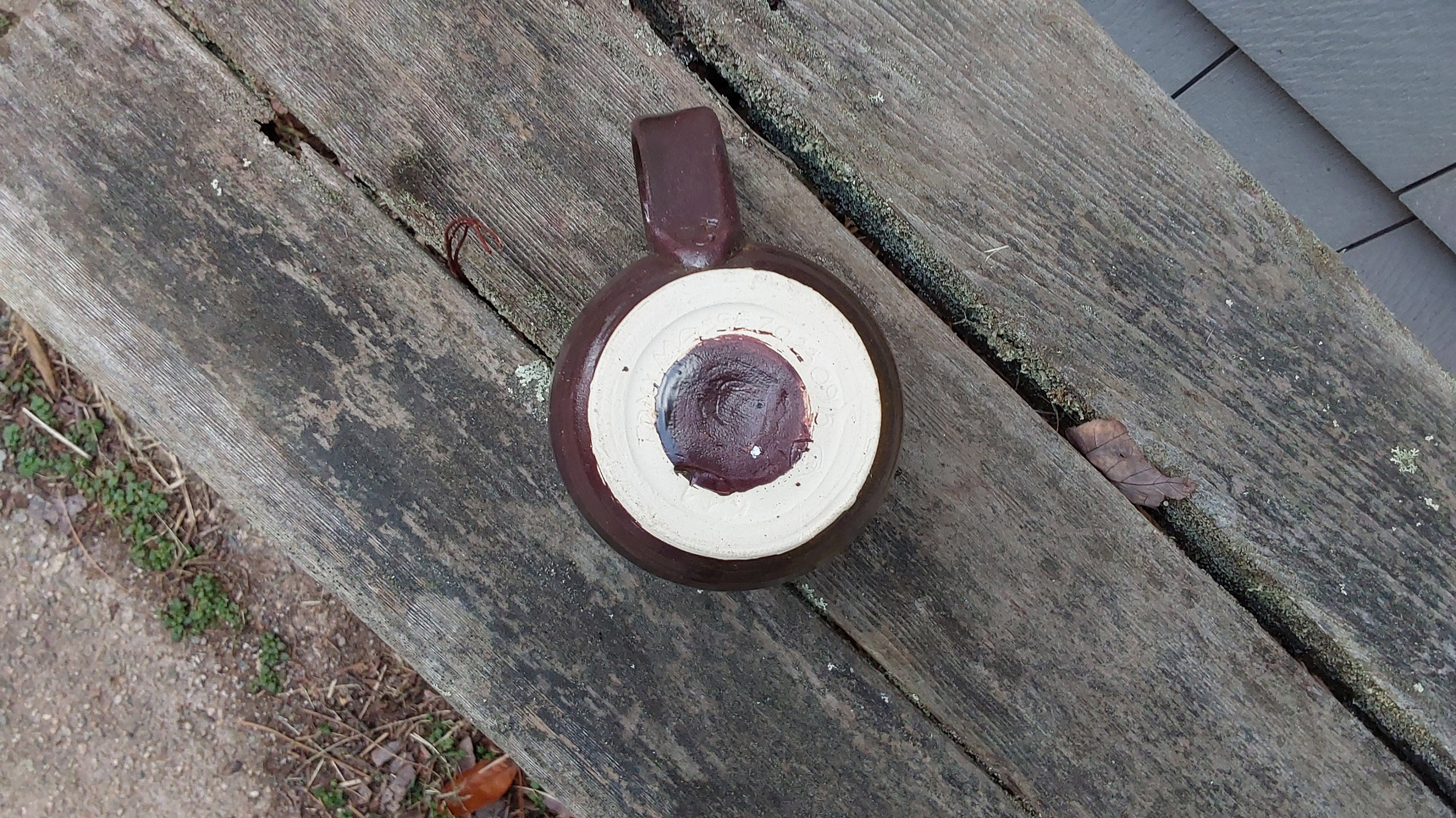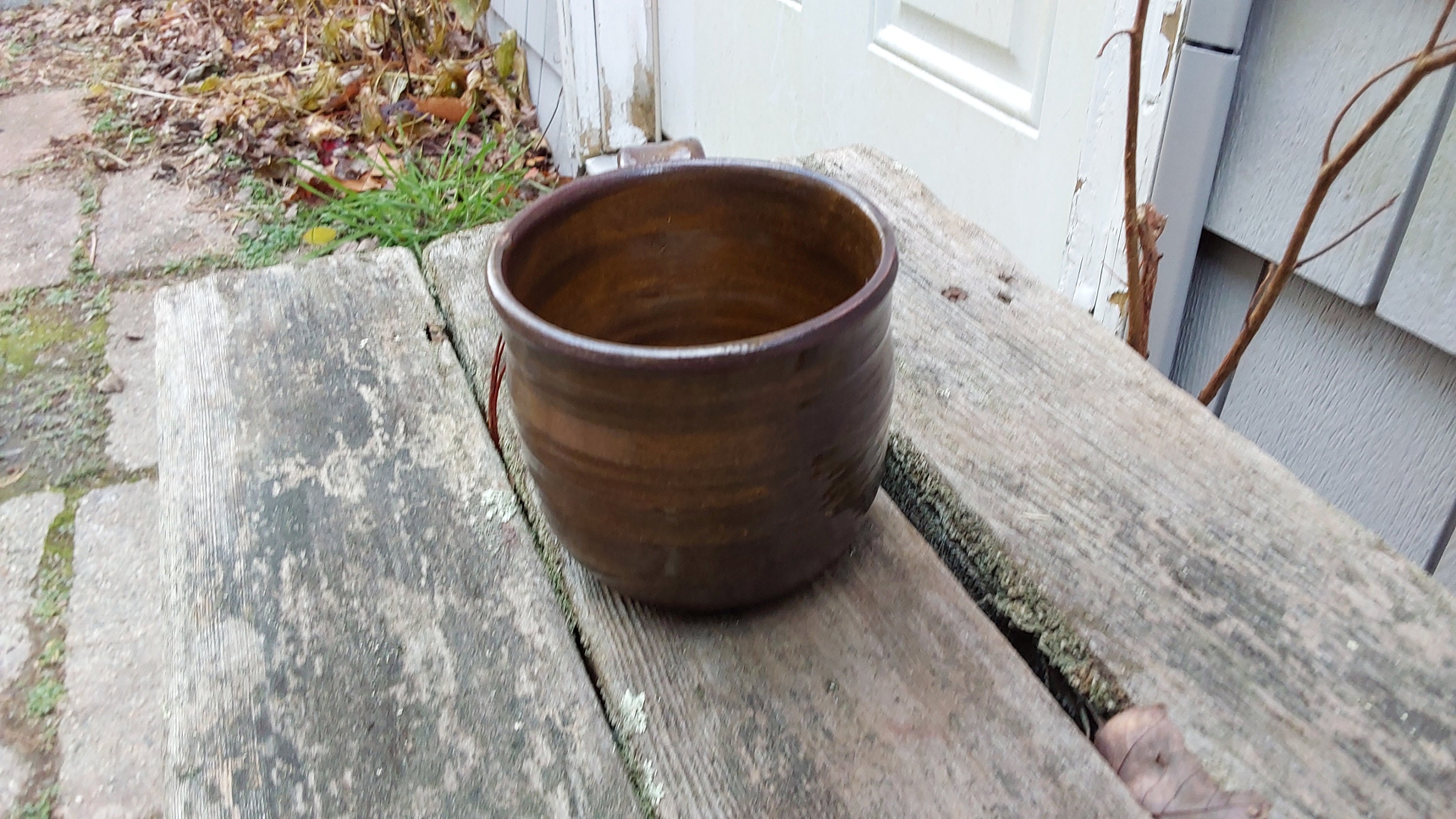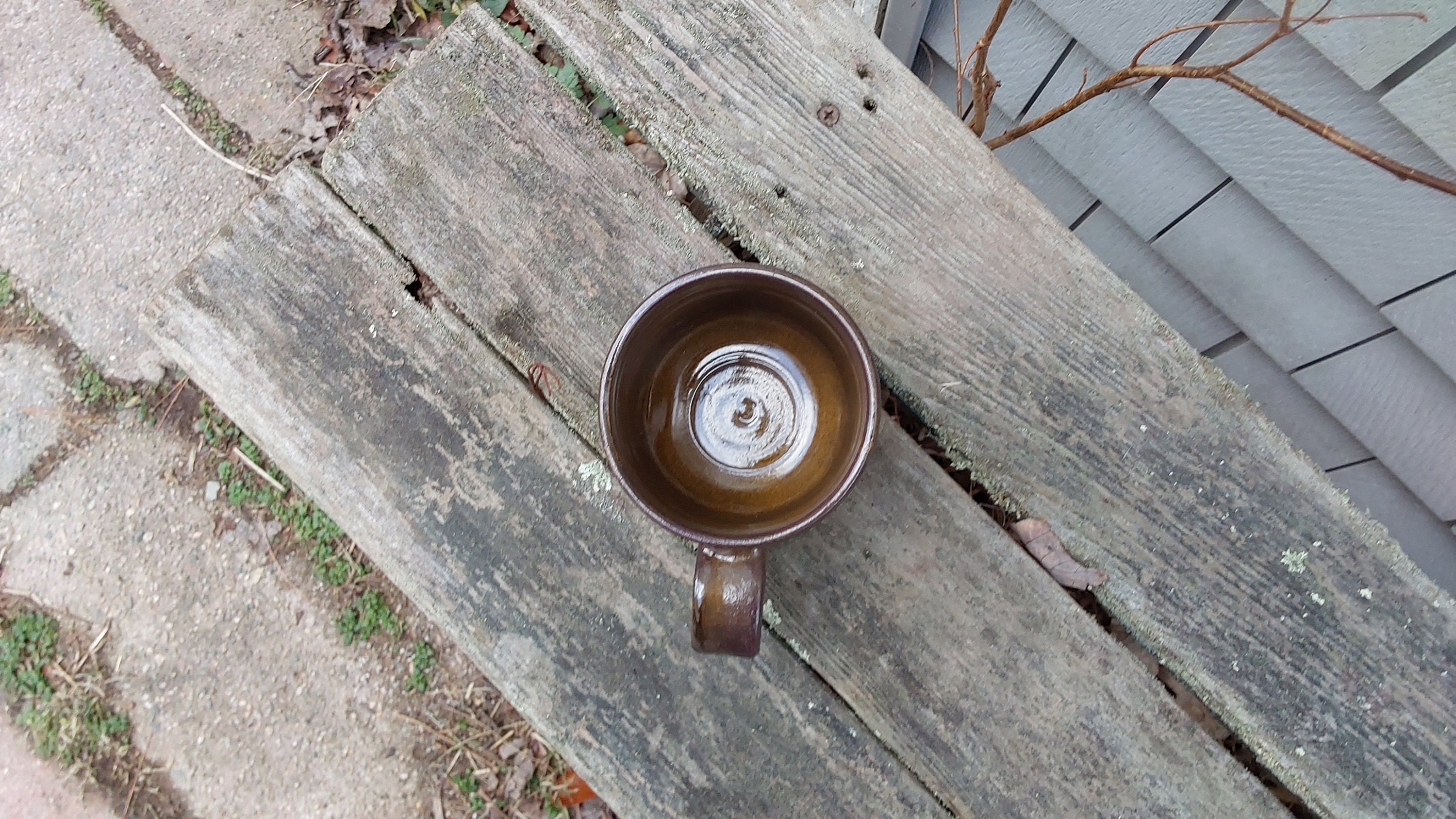 Cup is made from speckled stoneware clay. The cup has 2 coats of the brown tenmoku glaze which covers the clay speckles
