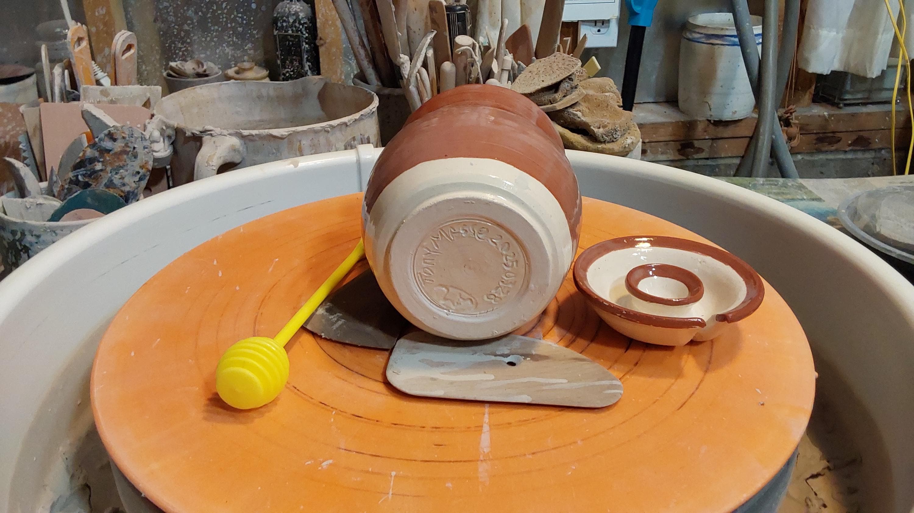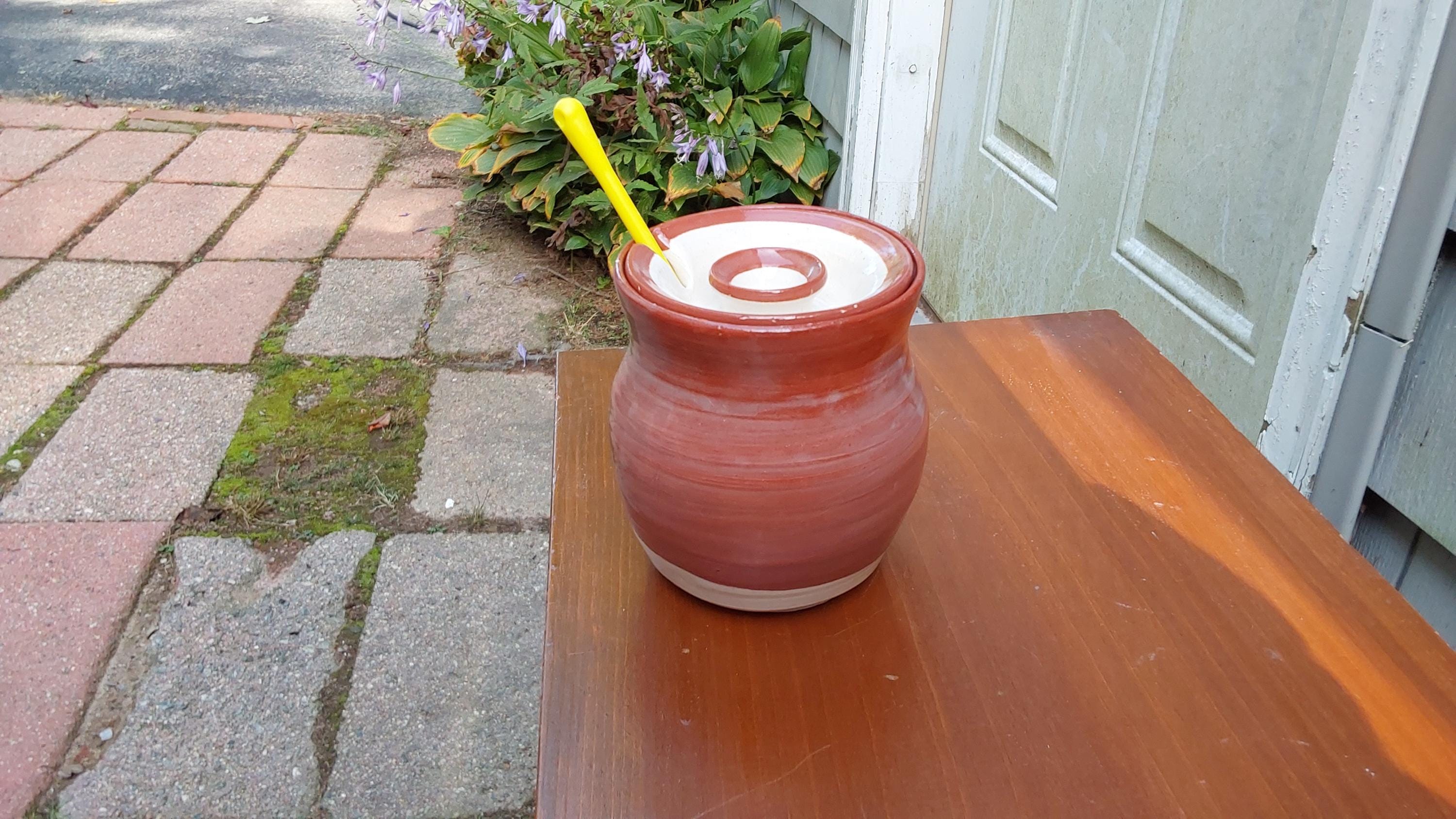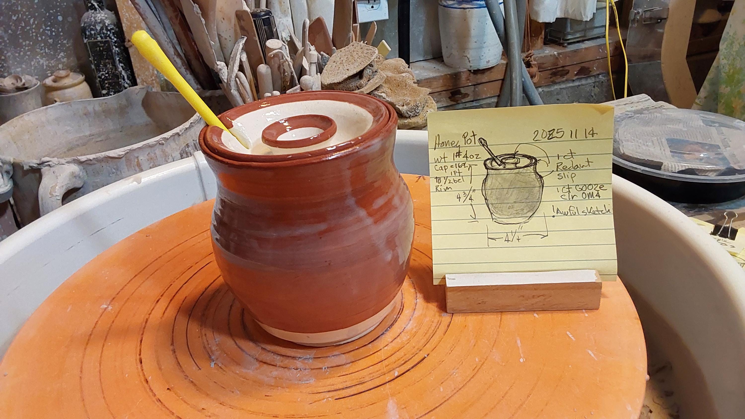 The jar is food-safe and microwave-safe (though microwaving honey isn’t recommended). The clay, underglaze, and clear overglaze meet safety standards. The plastic dipper—sourced from Amazon—is included.
