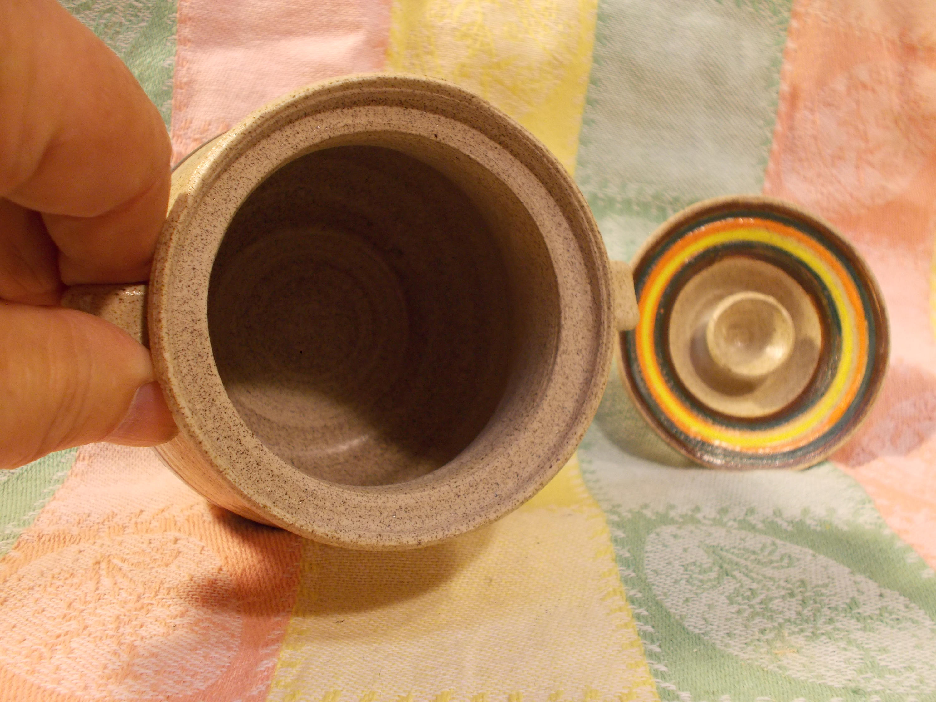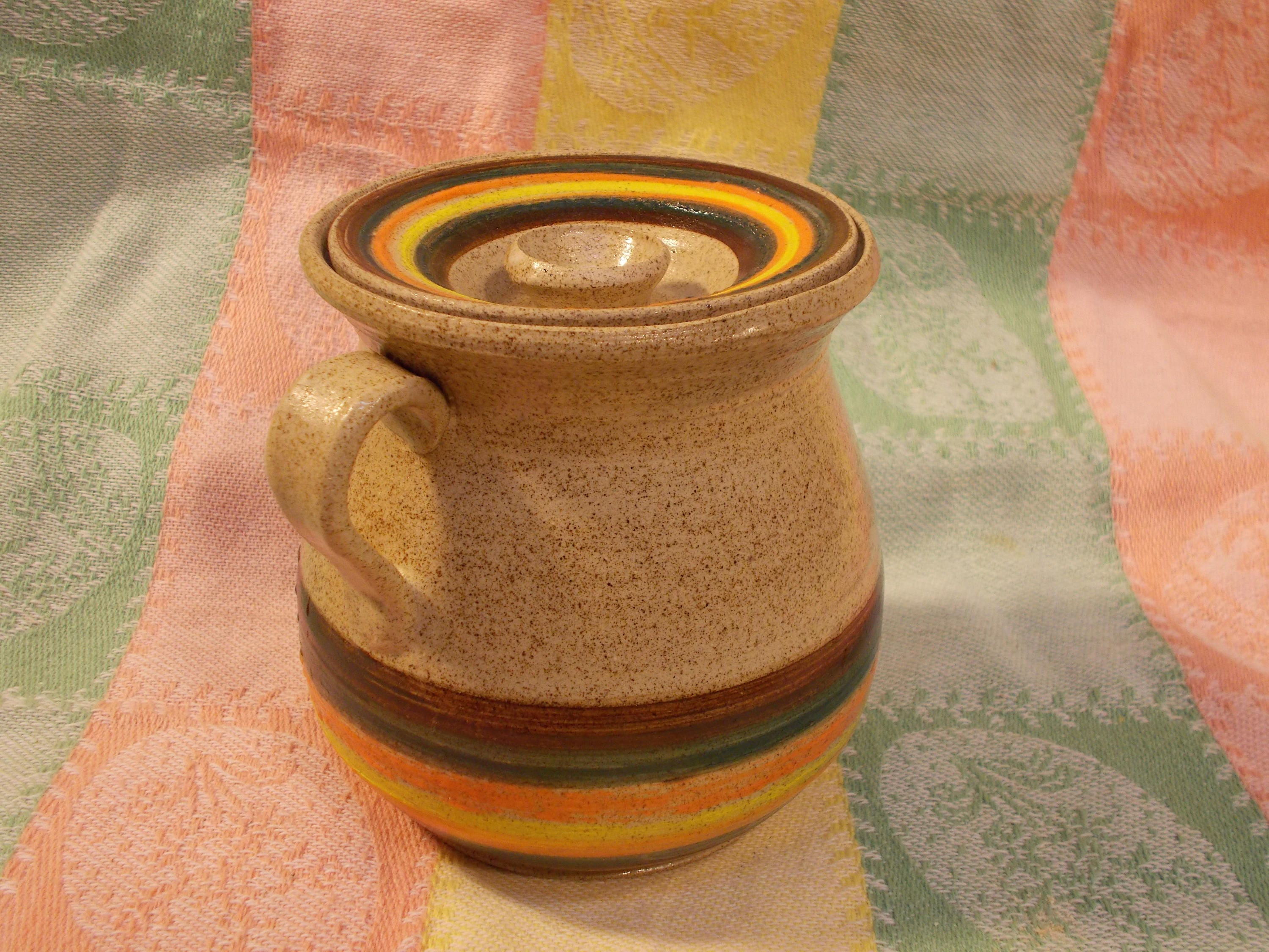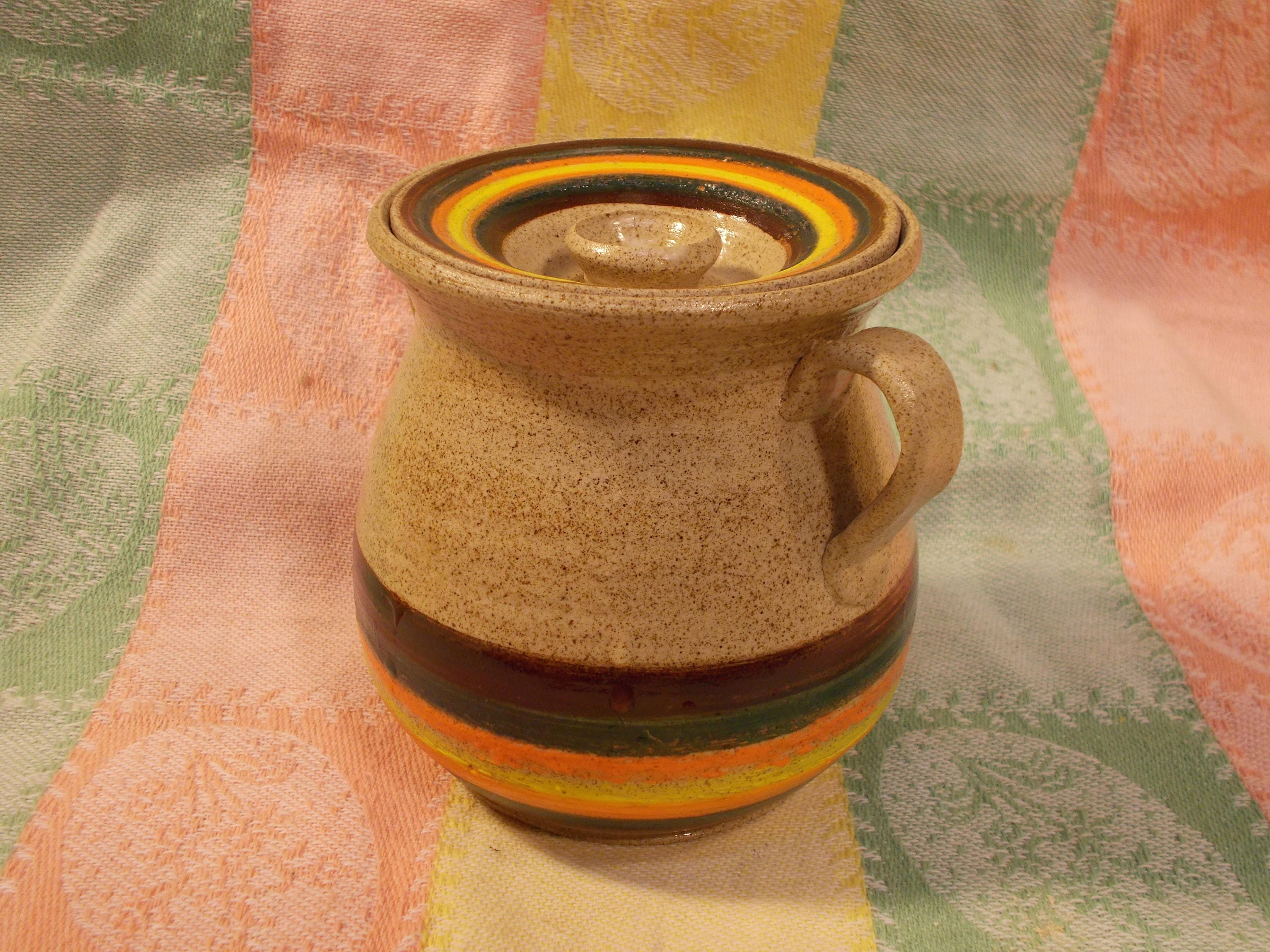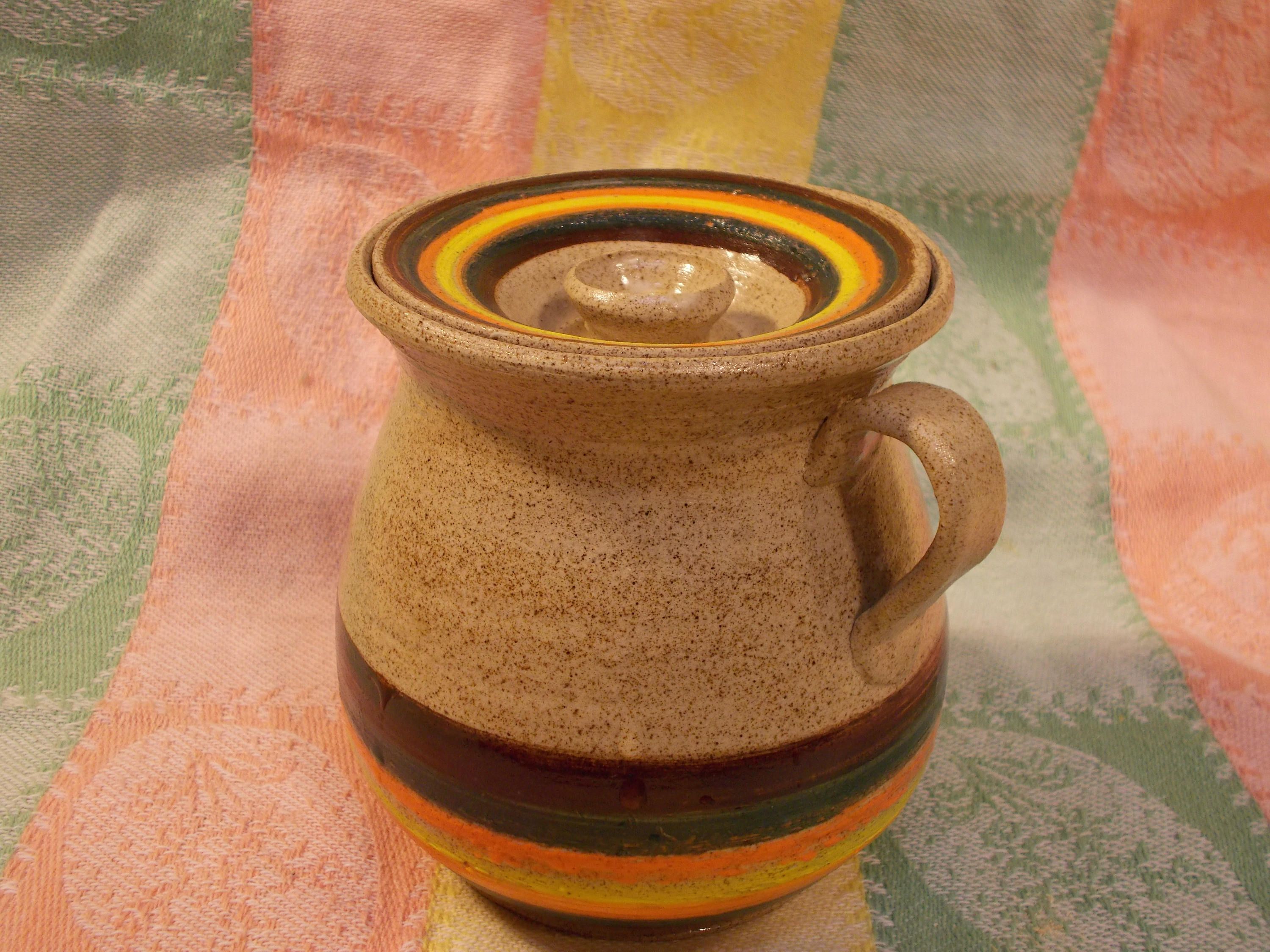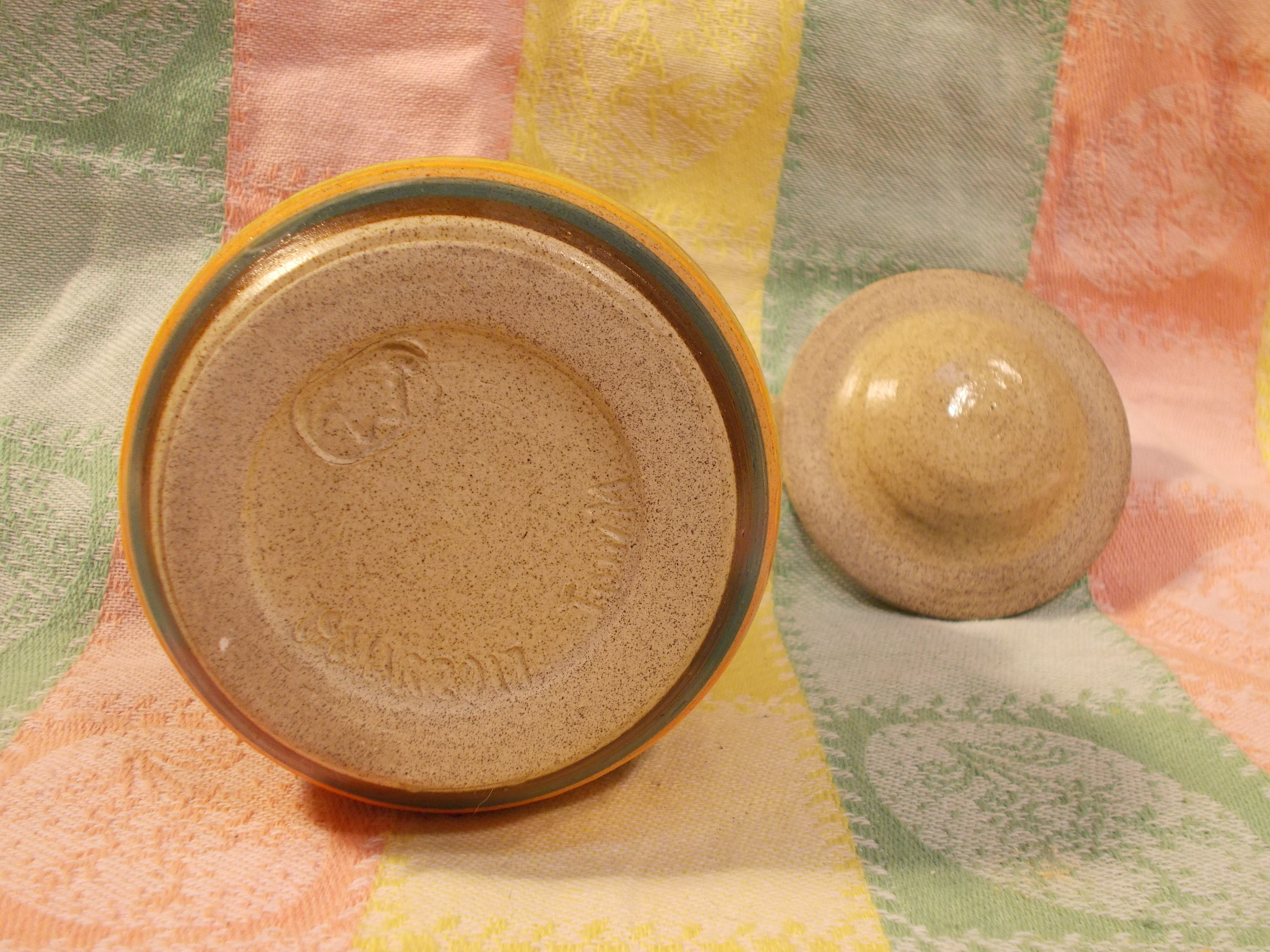 It's made of buff speckled stoneware, clear glaze over green, orange yellow and brown underglaze on the pot and the cover. The jar is 4-1/4" in diameter, 4-1/4" high and weighs 1lb-2 oz. without packing. It holds 1 pint or 2 cups to the bottom of the cover.